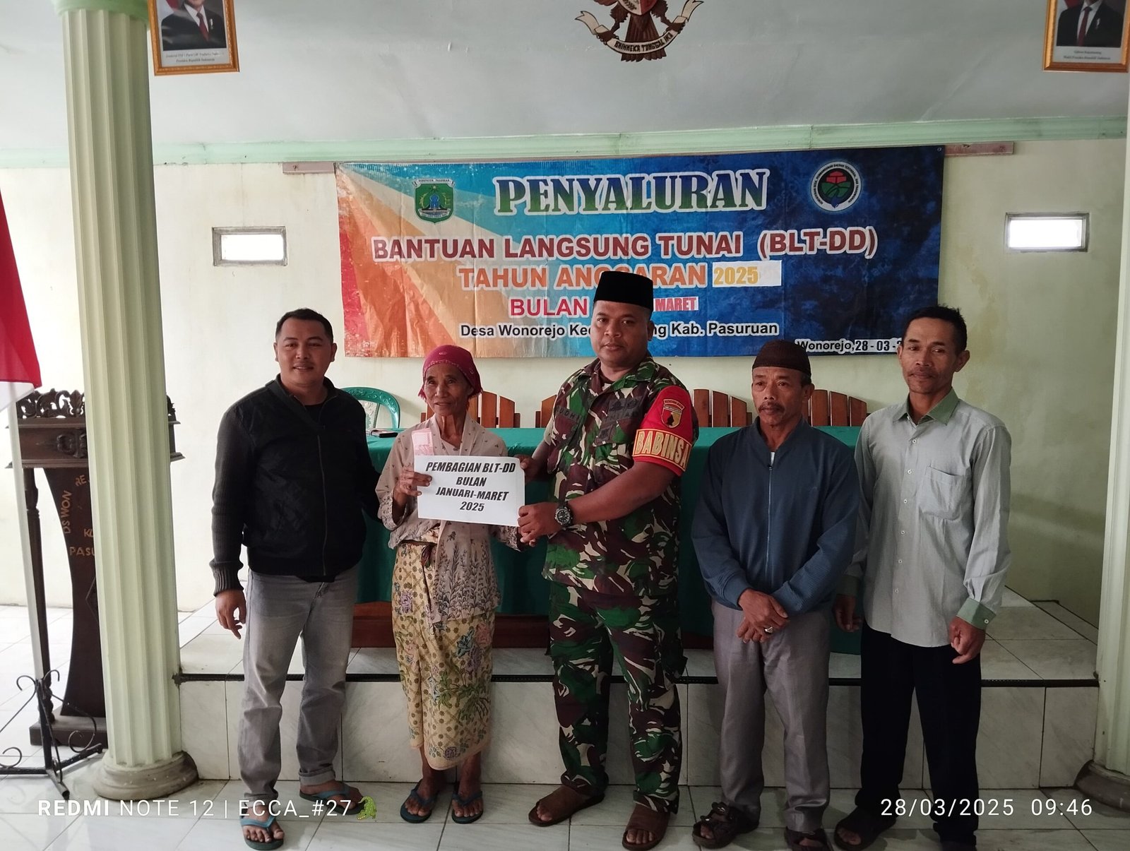 Kabarjatim.id | Pasuruan -Kopka Budi Rinarto Babinsa Koramil 0819/09 Lumbang menghadiri sekaligus melaksanakan pendampingan dan pengawalan kegiatan penyaluran Bantuan Langsung Tunai Dana Desa (BLT DD) anggaran bulan Januari, Februari dan Maret tahun 2025 bertempat di Balai Desa Wonorejo, Kecamatan Lumbang, Kabupaten Pasuruan, Jumat (28/03/2025).