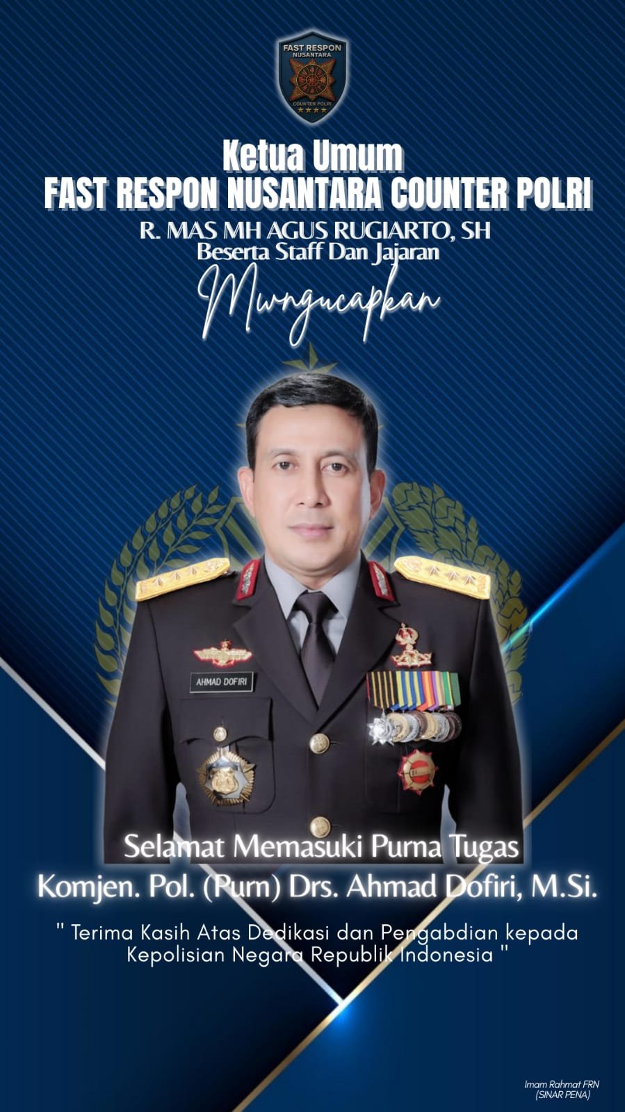 Fast Respon Nusantara Counter Polri berharap dedikasi dan pengabdian Ahmad Dofiri dapat menjadi inspirasi bagi seluruh jajaran Polri dalam melanjutkan tugas melindungi, mengayomi, dan melayani masyarakat Indonesia.