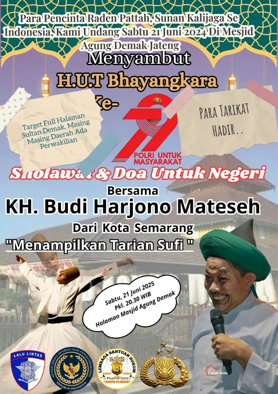 Demak – Dalam momentum menyambut Hari Ulang Tahun (HUT) Bhayangkara ke-79, berbagai elemen masyarakat, termasuk para dzurriyah (trah) Raden Patah, para pecinta Sunan Kalijaga dari seluruh Indonesia, dan pengamal tarekat, akan berkumpul dan bersatu dalam acara akbar bertajuk “Sholawat & Doa untuk Negeri” di halaman Masjid Agung Demak, Jawa Tengah, Sabtu malam, 21 Juni 2025.