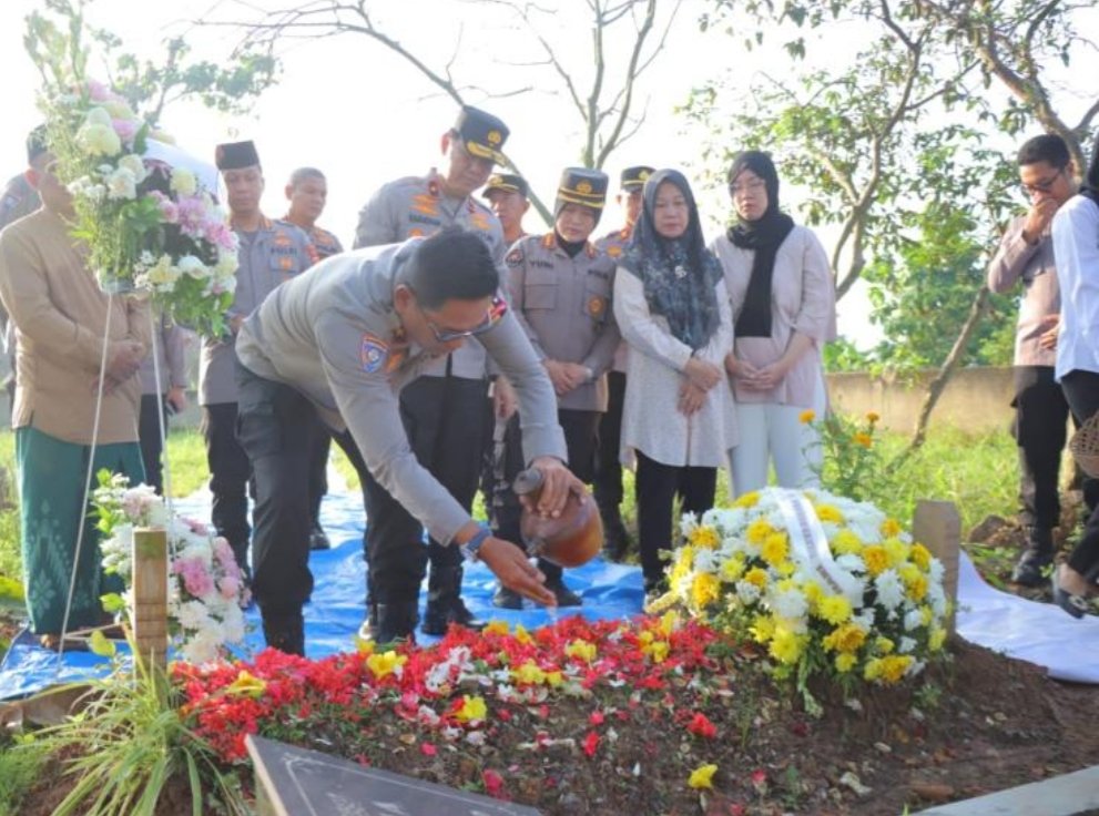 Kegiatan ini berlangsung khidmat di lokasi pemakaman almarhum, dan dipimpin langsung oleh Dir Bintibmas Baharkam Polri, Brigjen Pol M. Rudy Syarifudin, S.I.K., S.H., yang didampingi oleh Wakapolda Lampung, Brigjen Pol Dr. Ahmad Ramadhan, S.H., M.Si., M.H.