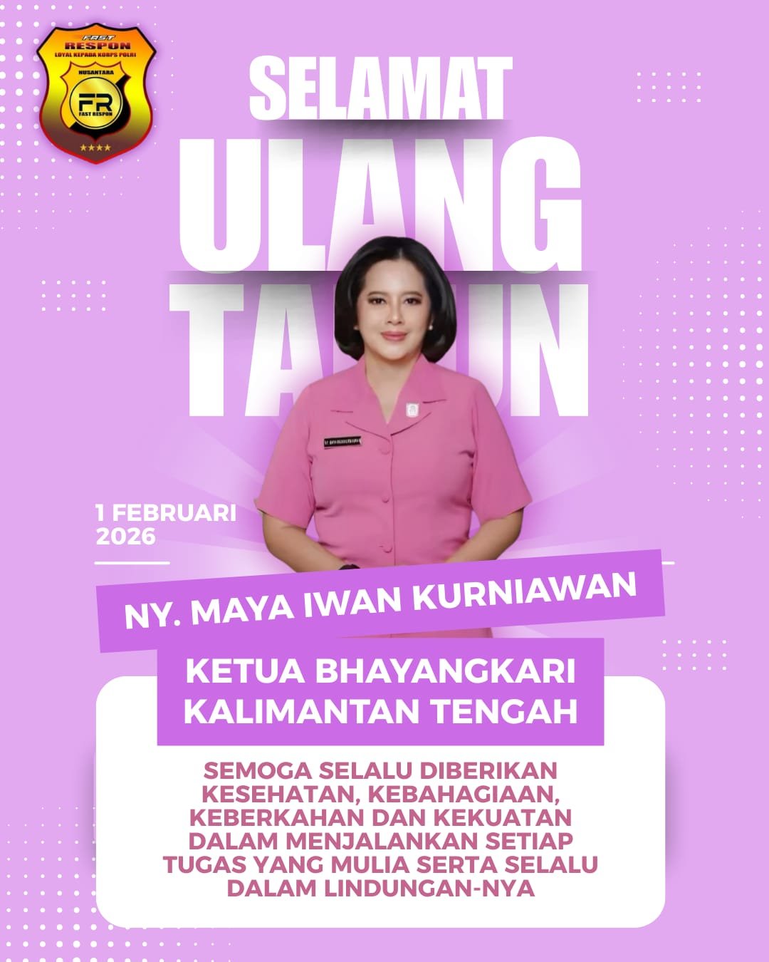 Jakarta, – Ketua Umum Perkumpulan Wartawan Fast Respon (PW-FRN), Agus Flores, beserta seluruh jajaran pengurus menyampaikan ucapan selamat ulang tahun kepada Ketua Bhayangkari Daerah Kalimantan Tengah, Ny. Maya Iwan Kurniawan, yang merayakan hari kelahirannya pada hari ini, Minggu, 1 Februari 2026.