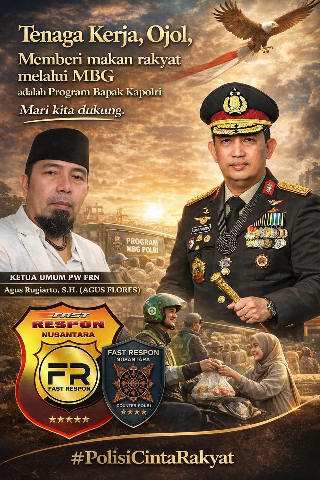“Kita harus mendukung program Bapak Kapolri, terutama terkait Program Tenaga Kerja, Ojol, dan pemberian makan gratis (MBG) yang dipimpin langsung oleh Wakapolri, Bapak Komjen Dedy Prasetyo selaku ‘Ketua Kelas’ program tersebut,” ujar Agus Flores.