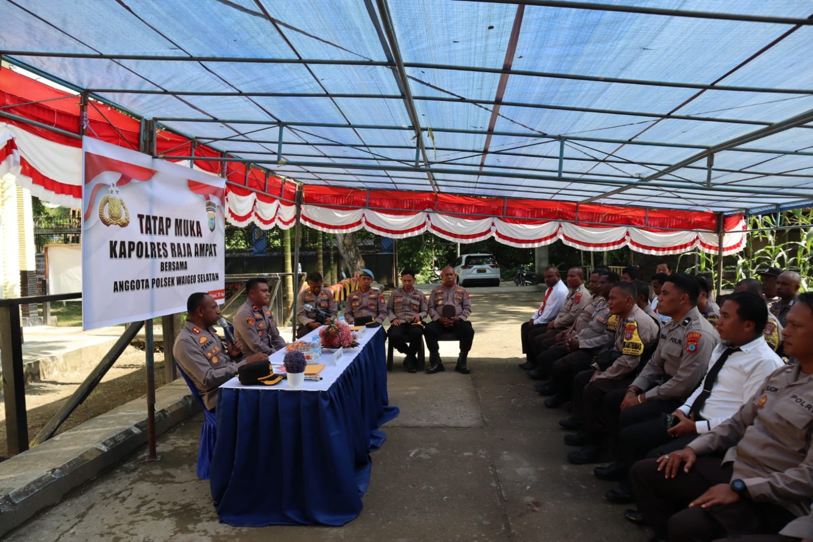 Kapolres Raja Ampat AKBP James O. Tegai S.I.K menyampaikan arahan mengenai peningkatan pelayanan kepada masyarakat, pengawasan terhadap pelaksanaan tugas anggota, serta pentingnya menjaga kedisiplinan dalam bertugas.