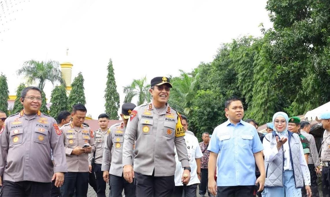 Kapolda Sulawesi Selatan Irjen Pol. Djuhandhani Rahardjo Puro, S.H., M.H., bersama Wakil Ketua II DPRD Sulsel Yasir Machmud, meninjau langsung pelaksanaan bazar dan gerakan pangan murah yang dilaksanakan di Mapolda Sulsel.