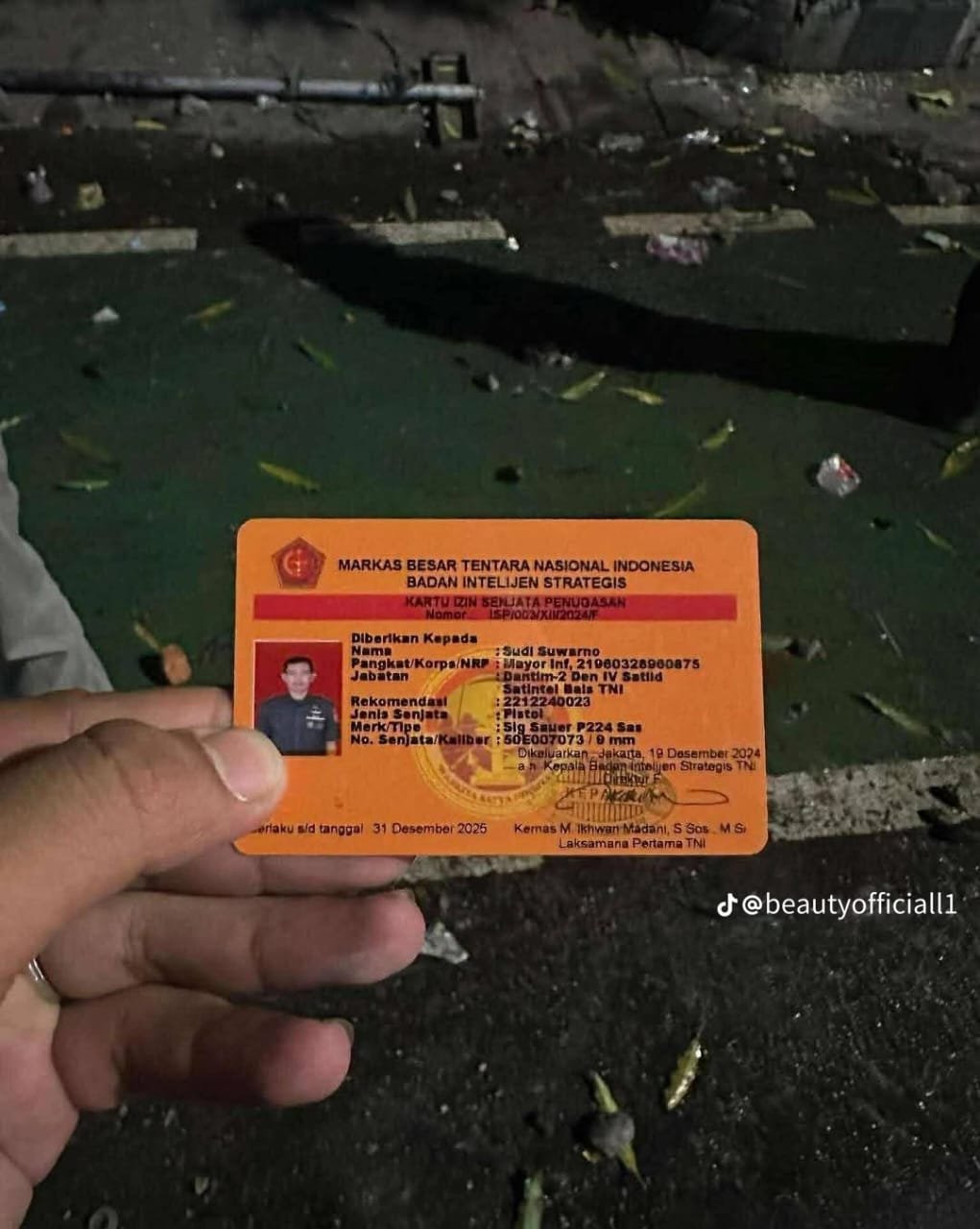 Belakangan terungkap, pria tersebut bukanlah warga biasa. Ia diketahui merupakan seorang perwira aktif TNI, berpangkat Mayor Infanteri atas nama Sudi Suwarno, yang berdinas sebagai anggota Badan Intelijen Strategis (Bais). Saat diamankan, yang bersangkutan juga kedapatan membawa senjata api lengkap.