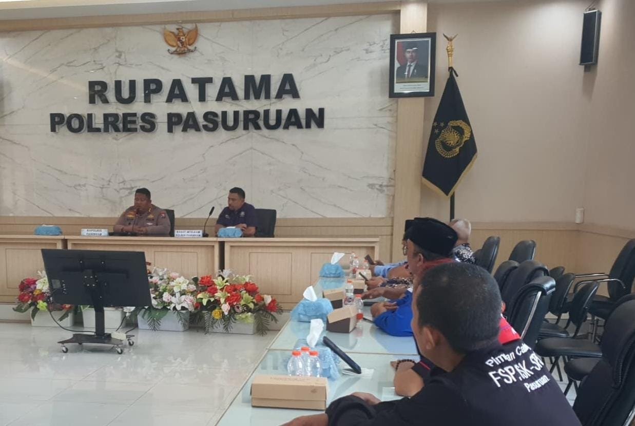 Kegiatan yang berlangsung di Ruang Rupatama Polres Pasuruan Polda Jatim itu juga membahas persiapan peringatan May Day 2025 serta upaya sinergi menjaga keamanan dan ketertiban masyarakat (Kamtibmas).