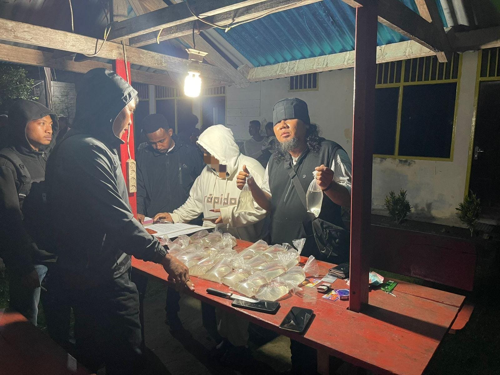 * Minuman Keras: Puluhan botol dan plastik minuman beralkohol berbagai jenis, mulai dari Cap Tikus (42 paket/botol), Vodka (13 botol), Bir kaleng jumbo (12 kaleng), Anggur Merah (11 botol), hingga Whisky Robinson (4 botol).