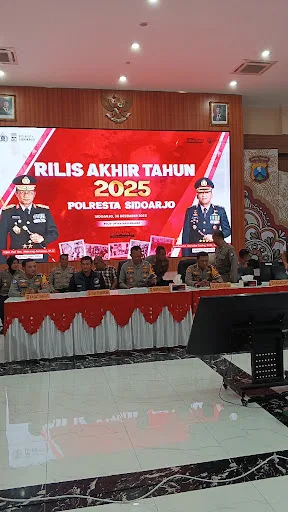 Iniberita.com | Sidoarjo – Polresta Sidoarjo menggelar rilis akhir tahun 2025 di Gedung Mapolresta Sidoarjo, Selasa (30/12/2025). Dalam kegiatan tersebut disampaikan capaian kinerja kepolisian sepanjang tahun 2025 yang menunjukkan tren positif, khususnya pada penurunan angka kriminalitas dan peningkatan pengungkapan kasus narkoba.