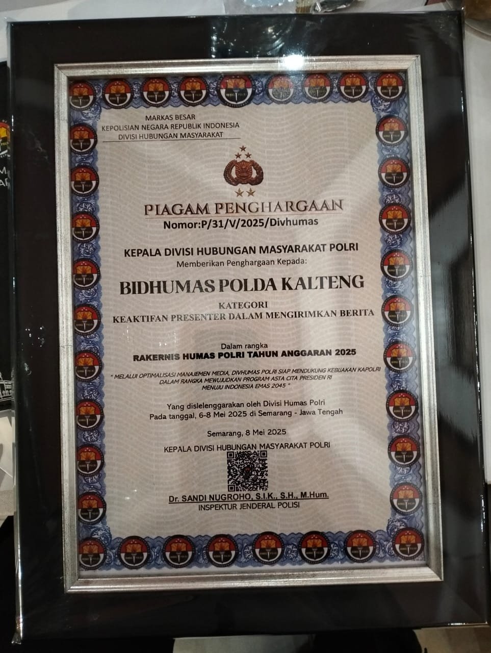 Dua penghargaan tersebut diserahkan langsung oleh, Kadivhumas Polri Irjen Pol Dr. Sandi Nugroho, S.IK., M.Hum kepada, Kabidhumas Polda Kalteng Kombes Pol Erlan Munaji, S.IK., M.Si. dalam rapat kerja teknis (Rakernis) Humas Polri Tahun 2025 di Gedung Serbaguna, Akademi Kepolisian (Akpol) Semarang, Jawa Tengah, Rabu (7/5/2025).