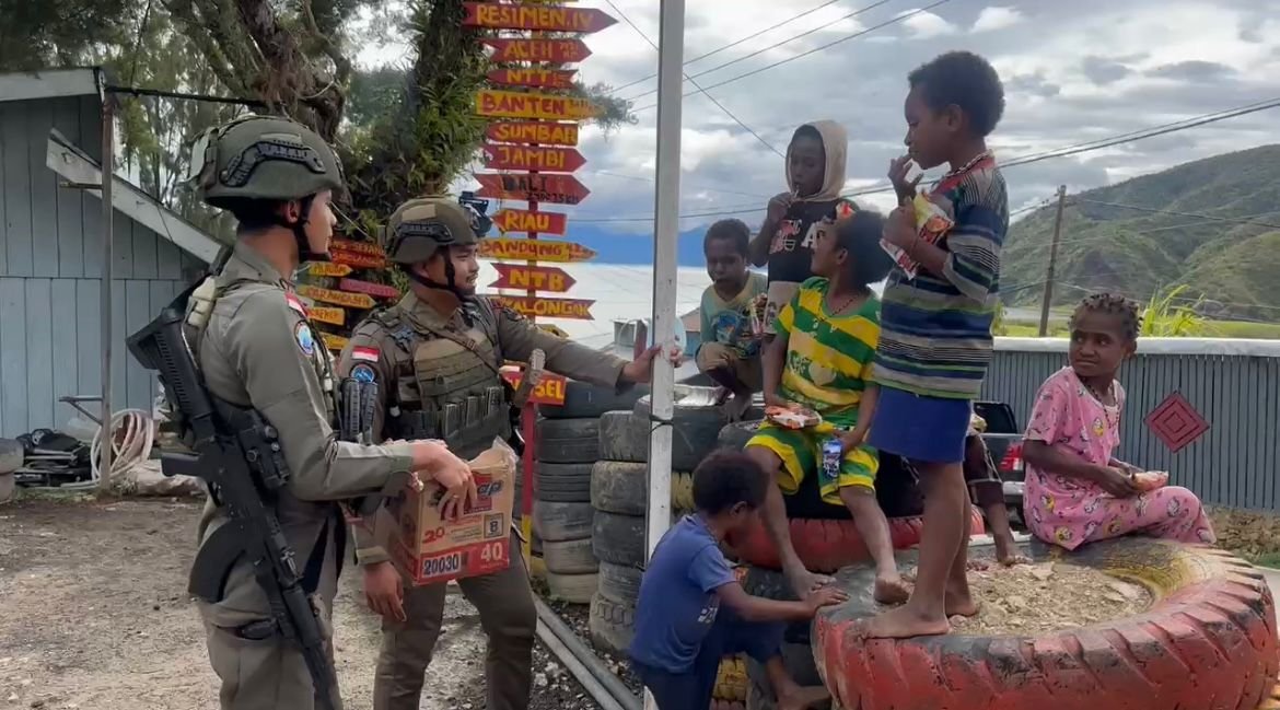 Papua Tengah, – Dalam rangka memperkuat pendekatan humanis dan membangun hubungan emosional yang positif dengan masyarakat, personel Satgas Ops Damai Cartenz kembali melaksanakan kegiatan sosial di dua wilayah berbeda yaitu Kabupaten Paniai dan Kabupaten Intan Jaya pada Minggu (13/7/2025). Kegiatan tersebut dilaksanakan di Poskotis Brimob Sektor Paniai yang dipimpin oleh Bripda Rizki Zulyansyah dan Bharada Yudi Setiadi. Kegiatan tersebut berfokus pada interaksi langsung dengan anak-anak di sekitar pos, termasuk bermain bersama, berbagi makanan ringan, dan memberikan ruang ekspresi bagi anak-anak untuk merasakan keceriaan bersama aparat keamanan.