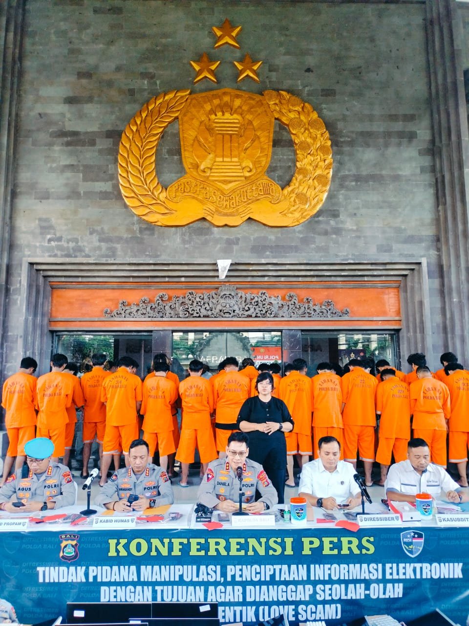 Bali, – Kapolda Bali Irjen Pol Daniel Adityajaya S.H., S.I.K., M.Si., didampingi Kabid Humas Kombes Pol Ariasandy S.I.K., dan Dirressiber Kombes Pol Ranefli Dian Candra S.I.K., M.H., Kabid Propam Kombes Pol Ketut Agus Kusmayadi S.I.K., dan para Kasubdit Ditsiber saat konferensi pers di lobi Mapolda pada rabu 11 juni 2025, menerangkan keberhasilan Ditressiber Polda Bali dalam pengungkapan tindak pidana sindikat penipuan online dengan mengamankan 38 orang pelaku dari lima TKP.